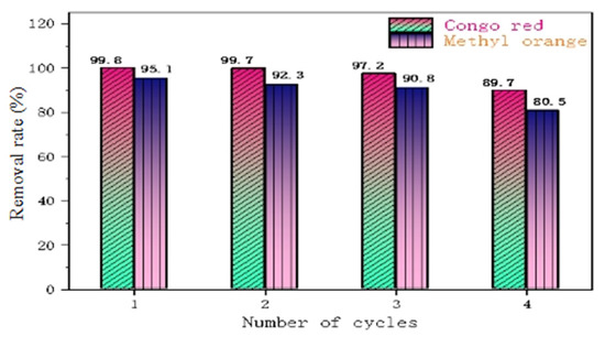 Figure 12 shows a comparison of the adsorption rates of CR and MO during the four cycles of the material, from which it can be seen that PLLA/CS–GO/TiO2 is better at adsorbing CR than MO in the process of recycling, as the removal rate of CR over the first three cycles is >97%, whereas the removal rate of MO over the first three cycles is >90%. In the fourth cycle, the pollutant removal capacity of fiber composite began to decline significantly, but the removal rate remained above 80%. The reason why the removal efficiency gradually decreases in the process of material recycling may be due to a small amount of fiber degradation and the loss of GO/TiO2 during desorption and ultrapure water treatment.