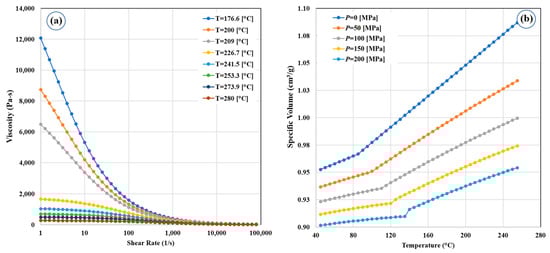 (a) Viscosity–shear rate and (b) Specific volume of HDPE.