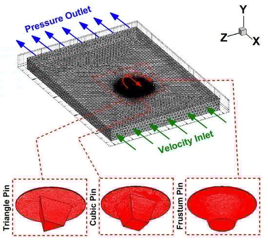 Three pin shapes were designed using frustum, triangular, and cubic geometries to study the effects of tool pin profiles. This simulation selected tetrahedral/hybrid elements with a T-grid shape for meshing the domain and used ANSYS Fluent software (ANSYS, Inc., Canonsburg, PA, USA) for equation solving. The simulation was tested by validating the results against experimental results. The overall errors of the simulation were less than 6% compared with experimental data. Figure 3 presents the meshed domain and pin profiles for the current work.