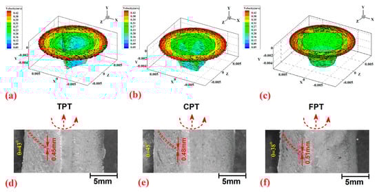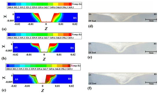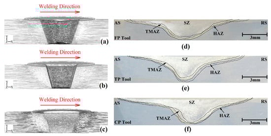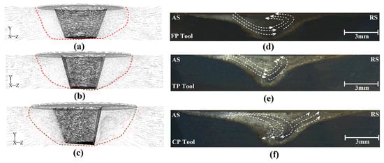 Internal flow can analyze the joining mechanism during the FSW of polymeric materials [44]. As discussed above, the internal flow of materials can be analyzed using simulation results. Figure 10a–c shows the cross-section view of the stirring areas made by FPT, TPT, and CPT pins, respectively. The simulation results indicated that the edges of the pin changed the internal flow. The internal flow of joints that were FSWed by FPT, TPT, and CPT pins are depicted in Figure 10d, Figure 10e and Figure 10f, respectively. The joining mechanism consisted of the uniform mixing of materials extruded from the AS to the RS. In the middle of the SZ, the plasticized polymer’s mixing pattern can determine the joint’s quality [45]. In the FPT-welded sample, the tool extruded materials from the AS to the RS, and a circular flow pattern can be seen in the SZ. In the TPT case, the materials were extruded to the middle and lower areas of the SZ and circulated in the middle of the SZ. In the case of the CPT pin, the flow pattern was non-uniform. The material was extruded from the AS to the center of the SZ. Some of the material reverted to the AS, and the rest was extruded to the RS. The analysis of experimental results revealed that during FSW of polymeric materials, the edges of the pin increased the irregular mixing pattern in the SZ. This flow pattern caused air bubbles to be trapped during the joining process and decreased the final quality of the joint.