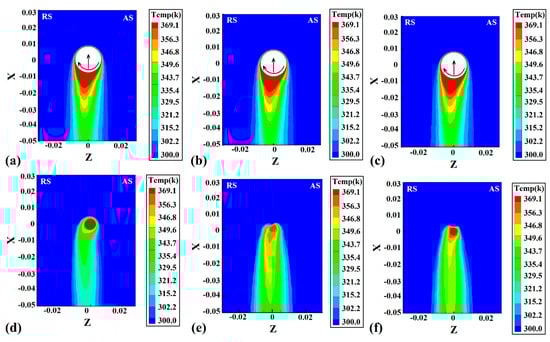 Simulation results of surface heat flow at joint FSWed by (a) FPT, (b) TPT, and (c) CPT pins. Simulation results of backplate heat flow at joint FSWed by (d) FPT, (e) TPT, and (f) CPT pins.