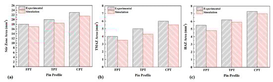 Comparison between dimensions of (a) stirred zone, (b) TMAZ, and (c) HAZ areas predicted by simulation and measured experimentally.