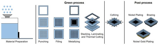 Compared with structural ceramics, functional ceramic devices are characterized by their detection, transformation, coupling, transmission, processing, and storage of information (i.e., electrical, magnetic, optical, acoustic, thermal, force, and biological []), and they have been used in numerous fields (i.e., aviation, automobile, integrated circuit, communication, medical, and energy) []. Most functional ceramic devices, such as multilayer ceramic capacitors, multilayer ceramic substrates, filters, chip antennas, power dividers, and duplexers, can be fabricated by a high-temperature cofired ceramic (HTCC) process or low-temperature cofired ceramic (LTCC) process [,,,,,]. These processes require multiple steps: (1) material preparation for ceramic tapes and functional pastes, (2) punching of the green tapes for via formation, (3) filling and metalizing for vertical conductors and horizon circuitries formation, (4) stacking and laminating for 3D ceramic green body formation that can be maintained as an array or cut into individual products, (5) cofiring, and (6) post processing including nickel plating, brazing, and gold plating (Figure 1) []. As a result, the metal pastes (e.g., silver, gold, tungsten, and molybdenum) and resistor pastes can be cofired with the ceramic body to fabricate multilayer ceramic components. With the continuous development of electronic science and technology, the HTCC and LTCC processes are poorly suited to the rapid prototyping and low-cost manufacturing of miniaturized, thin, refined, and highly integrated functional ceramic devices.