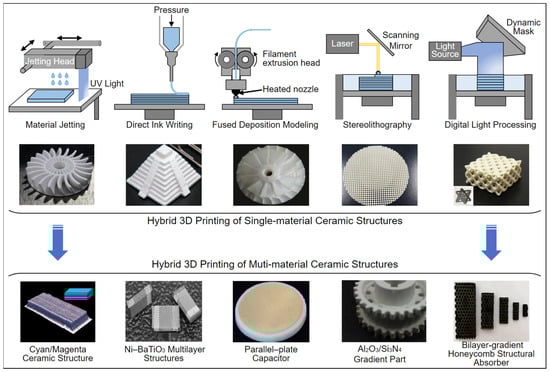 In recent years, 3D printing has become a research focus in fine ceramic manufacturing, and it can be used to construct most structural ceramics [,,,]. However, functional ceramic devices with a composite structure comprising two or more materials usually contain strip lines, microstrip lines, and vias; as a result, in addition to enhancing the spatial resolution and printing speed, several problems in terms of the raw materials, printing strategies, and sintering process still need to be solved. Multi-material 3D printing of functional ceramic devices is in early development and has great research motivation and application potential [,,,,]. Figure 2 shows several major 3D printing techniques, including material jetting (MJ), direct ink writing (DIW), fused deposition modeling (FDM), stereolithography (SLA), and digital light processing (DLP) []. Among them, MJ, DIW, and FDM can independently accomplish a multi-material 3D printing task by simply equipping the same number of nozzles or jetting heads as the material being processed because these techniques deposit materials directly to the desired voxel. However, SLA and DLP generally need to be combined with MJ, DIW, or other special techniques (e.g., sputtering and plating) to integrate multiple materials together into one object []. We review the latest progress in multi-material 3D printing for functional ceramic devices, including capacitors, multilayer substrates, and microstrip antennas, based on MJ, DIW, FDM, SLA, DLP, and a hybrid process simultaneously employing multiple techniques, and identify existing problems and future development directions for multi-material 3D printing of functional ceramic devices, which is expected to support future research.