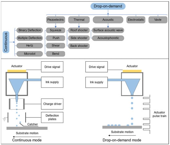 The principles of IJP were first developed commercially during the 1970s and 1980s and applied practically to marking products with dates and codes and addressing mail []. The IJP process involves the ejection and local deposition of a sequence of droplets with fixed volume (typically from 10−12 L to 10−9 L) in either a continuous inkjet (CIJ) or drop-on-demand (DOD) inkjet mode (Figure 3) []. In CIJ printing, ink droplets are continuously ejected from the orifice and deflected afterward to write spots on the substrate, recycling the droplets that are not selected in this way via a gutter []. In DOD inkjet printing, ink droplets are ejected from thousands of orifices, typically arranged in each printhead as an array by inducing a transient pressure pulse within the chamber only when printing is needed []. A DOD inkjet printer can adopt several printheads with different driving mechanisms: piezoelectric (PTZ), thermal, acoustic, and electrostatic (Figure 4a,b,d,e) [,], among which piezoelectric and thermal printheads are most widely used. Alternatively, a thermal printhead relies on a resistor to heat the ink within the ink chamber until a bubble expands in it, forcing a droplet out of the orifice []. In the PTZ printhead, a PTZ actuator located near the orifice deforms under an applied voltage, leading to a sudden reduction in the ink chamber capacity, which creates a shockwave in the ink and ejects the droplet. The deformation of the PTZ element specifically determines the types of PTZ jetting, such as “squeeze”, “push”, “shear”, or “bend” (Figure 4c) [].