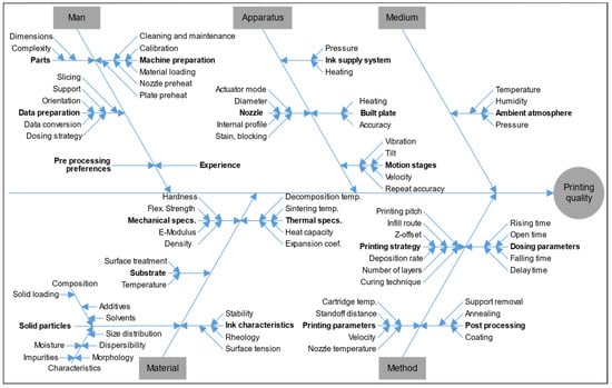 It is necessary to adequately understand the influence of various parameters on the quality of the final printed objects (Figure 5) [,,] and establish optimal process conditions. A basic prerequisite of the IJP process reliability is the stability of functional inks and their specifications in terms of viscosity and surface tension, which negatively affect the shape and speed of ejected droplets as well as the spreadability on a substrate []. There are four major types of functional inks for IJP, namely phase change inks, solvent-based inks, water-based inks, and UV curable inks, whose viscosity is typically required to be less than 30 mPa·s to ensure fast refilling of the ink chamber (even under fast duty cycles) and droplet ejection from orifices []. Notably, some printers equipped with industrial PTZ printheads (i.e., Xaar1003, Xaar Nitrox, Konica KM1800i, and GALAXY series) and advanced recirculation systems allow functional inks with viscosities up to 80 mPa·s. The appropriate surface tension is in the range of 35–60 mN/m []. Unwanted dripping and ink spreading over the orifice plate that affects the jettability occur when surface tension is too low, whereas the jet stream may not split into individual droplets when surface tension is too high. Moreover, a balance of viscosity and surface tension should be guaranteed to prevent the formation of satellite droplets or ink mist. The dimensionless number Z = 1/Oh (Oh is the Ohnesorge number, calculated by Equation (3)) first defined by Fromm [] is widely used to evaluate the printability of functional inks for IJP,