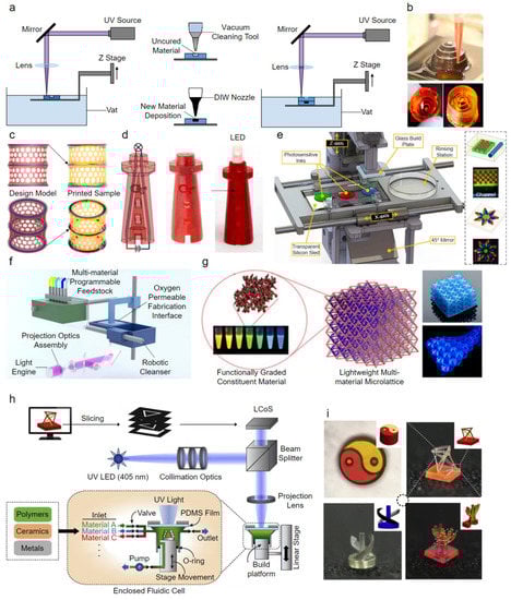 - Choi, J.-W.; Kim, H.-C.; Wicker, R. Multi-material stereolithography. J. Mater. Process. Technol. 2011, 211, 318–328. [Google Scholar] [CrossRef]