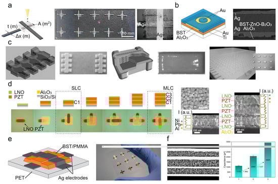 Multi-material 3D-printed ceramic capacitors. (a) Schematic illustration of the design concept of the Ag/Ca2NaNb4O13/Ag capacitor (left) and photograph of ten fully inkjet-printed Ag/Ca2NaNb4O13/Ag capacitors on a glass substrate (middle) and two overlapped Ag electrodes separated by the printed Ca2NaNb4O13 layer (right) []. (b) Schematic illustration of the design concept for the Ag/Ba0.6Sr0.4TiO3-ZnO-B2O3/Ag varactor (left), and SEM image of the fully inkjet-printed Ag/Ba0.6Sr0.4TiO3-ZnO-B2O3/Ag varactor (right) []. (c) Photographs of fabricated 784 MLCCs with 15 internal electrodes and, consequently, 14 dielectric layers using a multi-material 3D inkjet printer []. (d) Photograph of sequentially inkjet-printed LNO and PZT layers to form MLCC components (left), and SEM image of the fully inkjet-printed MLCC components on SiO2 substrate (right) []. (e) Schematic illustration of the design concept for the Ag/Ba0.6Sr0.4TiO3/PMMA/Ag capacitor (left) and a photograph of the fully inkjet-printed flexible capacitor array on PET substrate (right) []. (f) SEM image of the fully inkjet-printed MLCC component with three dielectric layers on a PET substrate (left) and increasing capacitances of the MLCC component with every additional layer (right) [].