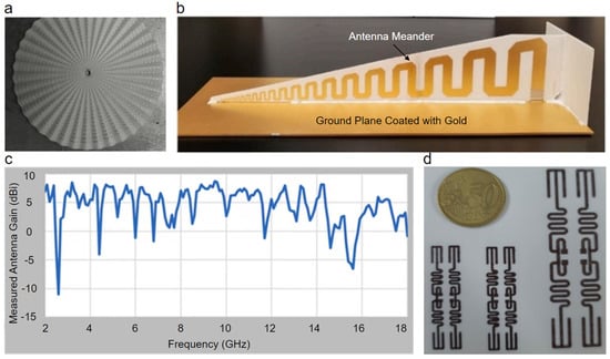 Multi-material 3D-printed ceramic microstrip antennas. (a) Photograph of the spiral microstrip antenna hybrid printed by NanoParticle Jetting™ and AJP []. (b) Photograph of the broadband microstrip antenna hybrid printed by DLP and AJP, and (c) measured gain versus frequency at room temperature []. (d) Photograph of the fully inkjet-printed antenna circuits [].