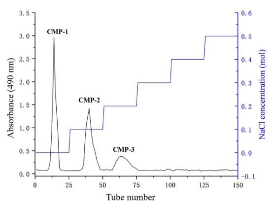The crude CMPs were prepared by hot water extraction followed by ethanol precipitation and freeze-drying, and then isolated using a DEAE-52 cellulose column (Figure 1). The three major polysaccharides peaks (CMP-1, CMP-2 and CMP-3) were obtained, which were eluted by the deionized water, 0.1 and 0.2 mol/L NaCl solution, respectively. The polysaccharide contents of CMP-1, CMP-2 and CMP-3 were 91.78 ± 2.11%, 92.95 ± 1.17% and 94.18 ± 2.18%, respectively. The yields of CMP-1, CMP-2 and CMP-3 were 24.31 ± 1.45%, 16.52 ± 1.04% and 10.02 ± 0.52%, respectively. The water soluble index of CMP-1, CMP-2 and CMP-3 was 98.67 ± 0.62%, 98.56 ± 0.83% and 97.85 ± 0.72%, respectively.