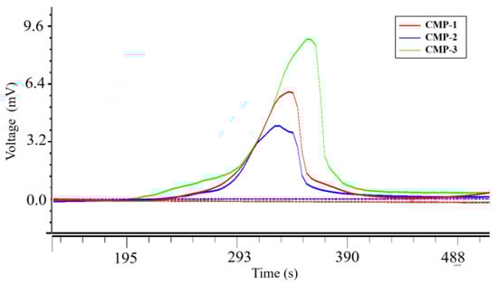 The HPGPC chromatogram of three polysaccharides are presented in Figure 2. They are all homogeneous polysaccharides demonstrated by their chromatographic curves exhibiting a single peak. The results of GPC software fitting and calculation showed that the molecular weights of CMP-1, CMP-2 and CMP-3 were 2.19 × 106 Da, 2.80 × 106 Da and 1.74 × 106 Da, respectively. Previous researchers have reported that the molecular weights of C. militaris polysaccharides were generally between ~103 Da and ~105 Da [30], and a kind of high molecular weight C. militaris polysaccharides (CMP-Ⅲ, 4.796×104 kDa) was isolated by He et al. [31]. The molecular weights of CMP-1, CMP-2 and CMP-3 were observed to be significantly higher than those of the C. militaris polysaccharides that were previously reported, which may be considered as high molecular weight polysaccharides.