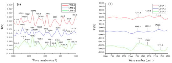 Moreover, the additional frequency band information of the three polysaccharides was obtained by the second derivative of infrared spectrum, which proved that CMP-1, CMP-2 and CMP-3 were of significant difference in the fingerprint region (800 ~ 1300 cm−1) (Figure 6a). In detail, CMP-1 has three weak absorption peaks (1109 cm−1, 1125 cm−1, 1151 cm−1) in the range of 1110 ~ 1160 cm−1, which may be attributed to side chains on α-carb\zon. Compared with CMP-1, however, there was no obvious absorption peak at 1125 cm−1 in CMP-2 and 1150 cm−1 in CMP-3, under the condition of neglecting the weak wave number shift caused by the tolerance error. The same situation was evident within the range of 990~860 cm−1; CMP-3 had six absorption peaks, while CMP-1 had only three broad absorption bands and CMP-2 had only four absorption peaks. Therefore, the second derivative proved that significant differences existed among the three polysaccharides in the fingerprint region. In particular, the weak absorption peak of 1730−1 cm in the second derivative spectrum (Figure 6b) suggested that they contained a small amount of uronic acid [44], which was consistent with the results of the monosaccharide composition.