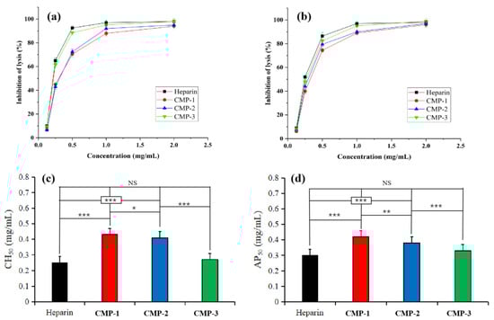 The anti-complementary activity of three polysaccharides with different dilution concentrations through CP (a) and AP (b). Comparison of CH50 (c) and AP50 (d). (NS: not significant, * p < 0.05, ** p < 0.01 and *** p < 0.001).