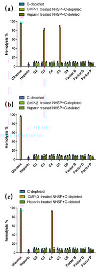 The targets of polysaccharides action were determined based on the changes in hemolysis rates, reflected by the depletion of different complement components with CMP-1, CMP-2 and CMP-3. If the polysaccharides interact with the complement component being measured, it can exhibit hemolysis that cannot be recovered [46]. As shown in Figure 9, none of the complement depleted sera independently lysed red blood cells, and their hemolytic percentages were not more than 20%. After treatment with CMP-1, the complement-depleted sera of C2, C4, C9, Factor B, Factor D and Factor P did not restore hemolytic, while the C3- and C5-depleted sera significantly restored hemolytic activity. This proved that CMP-1 was inferred to block the activation cascade of the complement system by targeting C2, C4, C9, Factor B, Factor D and Factor P, but not with C3 and C5. Similarly, Figure 9b showed that CMP-2 can inhibit complement activation by interacting with C2, C3, C4, C5, C9, Factor B, Factor D and Factor P. Additionally, Figure 9c illustrates that CMP-3 can inhibit complement activation by interacting with C2, C3, C5, C9, Factor B, Factor D and Factor P, but not with C4.