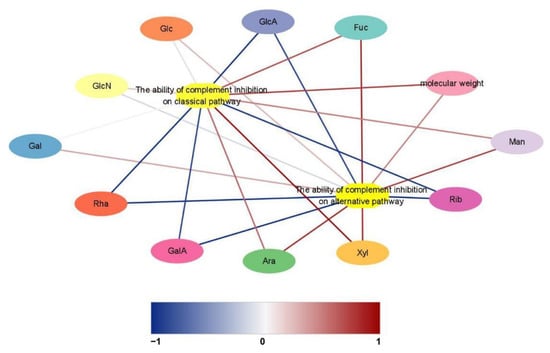 Network analysis of monosaccharide composition and molecular weight associated with the anti-complementary activity of CMPs. Red lines represent the positive correlation between structure and activity (r > 0.99). Blue lines represent the negative correlation between structure and activity (r > 0.99). The darker the line color, the higher is the significance of the correlation between structure and bioactivity.