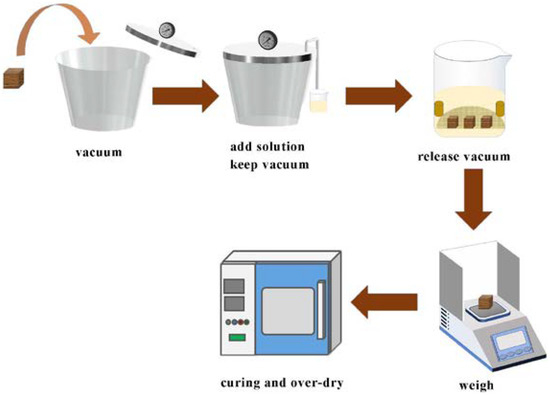 Furfurylation process (Figure 1): The specimens were subjected to a 30 min vacuum in the impregnation tank, after which the prepared solution was drawn into the tank with a hose under vacuum. The specimens were completely immersed in the solution. The vacuum was maintained after immersion for 1 h, then the vacuum was released, and the specimens were left in the solution for another 2 h. Finally, the impregnated specimens were wiped clean and weighed before being wrapped in aluminum foil and cured at 103 °C for 6 h. After curing, the aluminum foil was removed, and the specimens were dried at an increasing temperature gradient of 60 °C, 80 °C, and 103 °C for 4 h, respectively. The specimens were weighed and this value was recorded as the oven-dry weight. Ten replicates were used for each treatment.