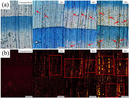The cross-sectional structure of both control and furfurylated wood is presented in Figure 4. It is evident that FA was impregnated into the tracheids, rays, and resin canals.