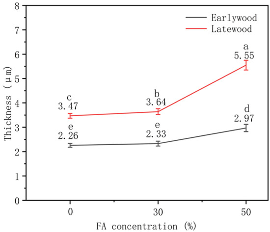 In addition to the changes in PFA distribution correlated to the FA concentration, the cell wall thickness also changed significantly. Image J was used to measure the thickness of cell walls. As shown in Figure 5, the average wall thickness of the control was 2.26 μm with a coefficient of variation (COV) of 15.8% for earlywood and 3.47 μm with a COV of 17.0% for latewood. The thickening of cell walls was not significant when treated with 30% FA, with only 3.10% and 4.81% thickening for the earlywood and latewood cell walls, respectively. In contrast, a significant thickening was achieved for those treated with 50% FA, with a cell wall thickening of 31.42% and 59.71%, respectively. Except for the earlywood of the untreated sample and furfurylated sample treated with 30% FA, other data showed statistical significance (p < 0.05). It was postulated that with the increase in FA concentration, the FA not only filled in the cell lumens but also polymerized in cell walls and become PFA. It diffused into the cell walls, causing cell walls to swell [8]. The penetrated PFA also formed a barrier within the wood that could prevent water absorption, resulting in a reduction in dimensional change in modified wood under various moisture contents [16].