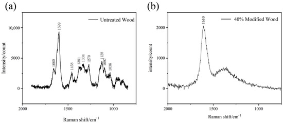 However, strong fluorescence was found in the spectrum after furfurylation with 40% FA (Figure 7b), and only two characteristic peaks were evident at around 1610 cm−1 and 1350 cm−1. A further study using UV excitation will be tried to alleviate the background fluorescence [20].