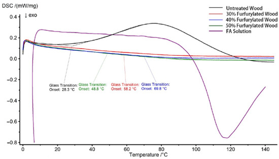 DSC analysis of untreated and furfurylated specimens with different FA concentrations were given in Figure 8. There was a broad endothermic peak at around 76 °C for untreated wood samples, which might be due to the enthalpy relaxation of lignin at the glass transition, as the material gained entropic freedom [21,22,23]. In contrast, the trends of the DSC curves of the three groups of furfurylated wood were similar, without any endothermic or exothermic peaks within the programmed temperature range. This implied that the furfurylated specimens were completely cured; new stable chemical bonds were formed between lignin and FA, which had no enthalpy relaxation; and the thermal stability of modified wood was much better than the control. The glass transition temperature (Tg) of all groups of specimens is listed in Table 2. The Tg values were calculated and generated by NETZSCH-Proteus-80 software. Results showed that the Tg increased with increased FA concentration. It was proposed that the rigid PFA formed both in the cell lumens and within the cell walls and the cross-linking reaction between FA and the cell wall components synergistically contributed to the increase in Tg [24,25] since either self-polymerization of FA or cross-linking reaction would result in thermosetting polymers with high rigidity [25]. A higher concentration of FA led to higher degrees of cross-linking reactions, which reduced the mobility of molecular chain segments of cell walls and finally had a higher Tg. On the other hand, more reaction sites also formed for the self-polymerization of FA, which increased the Tg.