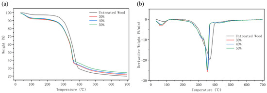 The decomposition rate slowed down above 450 °C, with only lignin degradation and graphitization thereafter [33,34]. The final mass loss percentage of the untreated specimen was 80.11%, while those of the furfurylated ones were 78.15%, 77.01%, and 75.68%, respectively, as shown in Table 3. The mass loss gradually decreased with the increase in FA concentration. The percentage mass residue of untreated, 30%, 40% and 50% specimens were 19.88%, 21.67%, 22.70% and 24.26%, respectively. The reason that furfurylated wood had a higher amount of residual carbon was that, in essence, there is higher carbon content in FA [10]. FA had a chemical cross-linking reaction with cell wall components and generated a new bond while rearranging and cyclizing aromatization by itself. It protected the wood to some extent, consequently, enhanced its thermal stability [35,36].