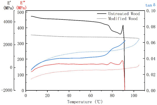 The thermo-mechanical behavior of untreated and furfurylated wood with 50% FA concentration was evaluated by DMA. The results of storage modulus (E’), loss modulus (E”), and damping factor (tanδ) are shown in Figure 10. Both the E’ and E” of the specimens decreased with increasing temperature, which was due to the fact that the mobility of the polymer chains in the cell wall increased with rising temperatures [37]. The lower E’ of the furfurylated wood indicated that the penetration and cross-linking effect of FA into the cell wall interrupted the crystalline structure of cellulose. Besides, the addition of PFA decreased the storage modulus due to intermolecular and intramolecular interactions that can alter the physical state of the wood matrix [32,36,38]. The E” of the untreated wood sample was always higher than that of the modified sample before its fracture, indicating that the incorporation of FA reduced the viscosity and the ability of energy consumption within the wood. Before the fracture occurred, the tanδ of the modified sample was higher than that of the untreated one, indicating that the molecules were less mobile and the wood dissipated more energy during the dynamic mechanical test. The reason was that the movement of the cellulose molecular chain was limited by FA and made the wood more brittle [36]. In addition, as the temperature reached about 75 °C, the untreated sample started to soften and deform. At 90 °C, it fractured completely while the modified one remained stable. This was in agreement with the DSC results, indicating that the incorporation of PFA into the wood matrix enhanced the ability of wood to resist deformation.