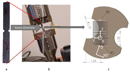 The fibrous ply orientation orthogonal to the axis of rotation of a sample in the micro-tomography may lead to the appearance of artefacts in the image of the ply [25]. The artefacts can be diminished if the so-called “canted” positioning of the sample in the loading rig is used [26]. Figure 1 shows the arrangement of the imaging. The DENT sample (Figure 1a) is installed into the test rig (Figure 1b), which is canted—the test rig, and, hence, the sample rotation axis, are inclined by 15° to the vertical, and thus no plies in the laminate are parallel to the beam direction anymore. Figure 1c shows schematically the central region of the DENT specimen and the positions of two images, P1 and P2 (overlapped for the following merge in software).