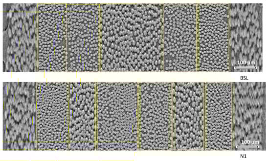 There were no voids visible when the images were visually inspected. However, certain artefacts, which could be taken for micro-void presence, were detected on the images. These artefacts are illustrated in Figure 4. They were seen on the images as black spots of 5–10 µm in size, located next to the fibers. When the image was segmented with the threshold grey value of 30 (black is 0 and white is 255; the threshold value was determined based on the analysis of the grey scale histograms), the mentioned artefacts were features with a size significantly below 1000 µm3 and an average aspect ratio below 10. Such features could be attributed to micro-voids. However, several reasons have led to conclusion that these features were imaging artefacts. As it is seen in Figure 4b,c, the “voids” were seen/not seen in specific plies with the same actual fiber orientation in BSL and N1, even if these plies were positioned differently in the laminate thickness (cf. Figure 2): in the inner plies oriented at 60° to the rotation axis, there were no “voids” seen, and low “voids” numbers were observed in the outer plies, oriented at 75° to the rotation axis. The existence of real voids would not depend on the ply orientations. Moreover, the “voids” were observed only from one “lower” side of the fibers (see Figure 4a). Finally, the “voids” were not seen in optical micrographs with a higher resolution, see [15]. Such artefacts on the boundaries of “white” regions were also seen in images, as shown in [27]; the scan orientation artefacts in relation to voids are discussed in [28].
