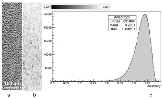 Anisotropy inside plies, a typical case (BSL11, ply −45°): (a) a slice of the ROI; (b) distribution of degree of anisotropy in voxels (with isotropy presented as black color and anisotropy as white color); (c) histogram of the degree of anisotropy.