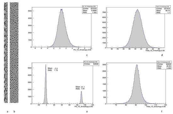 Figure 6 illustrates a typical result of the orientation analysis, for in-plane and out-of-plane, for the example of ply 0° (Figure 6b–d) and interface 90°/0° (Figure 6a–f) in a BSL image. The mean and standard deviation (RMS), indicated on the graphs, characterize the ply misorientation and fiber misalignment, respectively. In the case of in-plane orientation on the interface (Figure 6e), two histogram peaks appear; in this case, the mean and standard deviation are calculated separately for two parts of the distribution and the average of two is used for the final characterization.