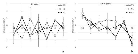 Misorientation of plies: (a) in-plane; (b) out-of-plane. Horizontal axis enumerates values of the nominal ply orientations. Error bars are standard deviations in four 3D images.