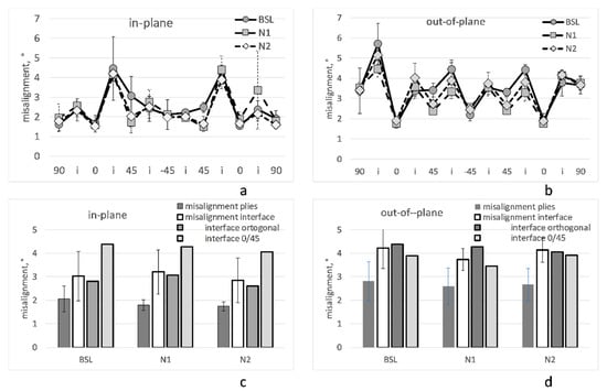 Misalignment of fibers deep inside plies and at the interfaces: (a,b) misalignment of in-plane (a) and out-of-plane (b) angles; horizontal axis enumerates values of the nominal ply orientations and interfaces (“i”) in-between the plies; (c,d) average values of in-plane (c) and out-of-plane (d) misalignment angles inside plies and at the interfaces.