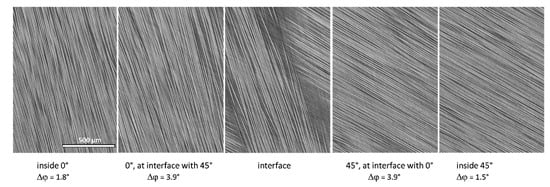 - Misalignment at interfaces: Normally higher than inside the neighboring plies by about 1° both for the in- and out-of-plane angles. The fiber misalignment is illustrated in Figure 9, which shows in-plane slices in 0° and 45° plies and at their interface. In-plane misalignment at interfaces with 45° difference of plies orientations (interfaces 0/45°) is about 1° larger than at the interfaces of plies with orthogonal orientations (interfaces 0°/90° and +45°/−45°). For the out-of-plane misalignment at the interfaces, this difference is not observed.