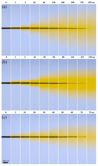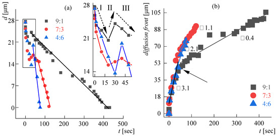 At the initial moment, the speed of the diffusion front is constant for all solvents and is equal to 3.1 ± 0.3 µm∙s−1. Approximately 40 s later, a bifurcation point appears (it is shown by the arrow in Figure 5b), where the front propagation velocity decreases, but in a different way for different dissolving systems. Quantitative features of this process are reflected in Table 2.