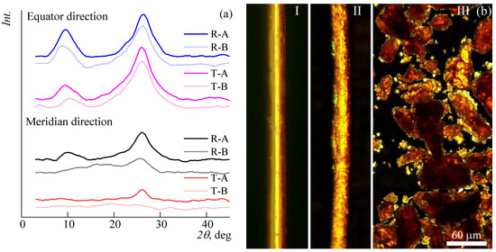 (a) X-ray diffraction patterns of ABPBI fibers in equator and meridian directions before (B) and after (A) partial dissolution at reflection (R) and transmission (T) modes; (b) ABPBI fiber before (I) and after (II) partial dissolution, and the powder (III) images in linear crossed polaroids.