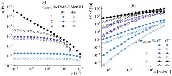 Dependences of viscosity on shear rate (a) and elastic and losses moduli on frequency (b) for ABPBI solutions. The data for the DMSO:MeOH ratio of 9:1 are shown as filled symbols, and for the ratio of 4:6 they are open.