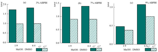 Dependence of the slope tangent of dynamic moduli in the low-frequency range on the MeOH:DMSO ratio, in solutions with a concentration of (a) 3, (b) 7, and (c) 9%.