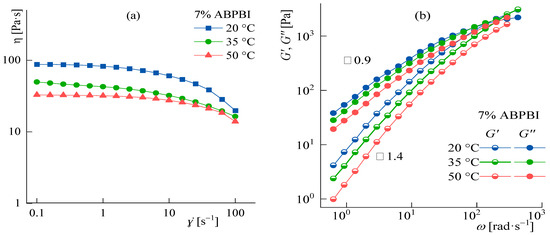 The upper temperature range of the studied solutions is limited by the methanol boiling point (64 °C). Therefore, the measurement of rheological characteristics was carried out at temperatures not exceeding 50 °C. The flow curves and frequency dependences of the moduli at 20, 35, and 50 °C for a chosen 7% solution are presented in Figure 10.