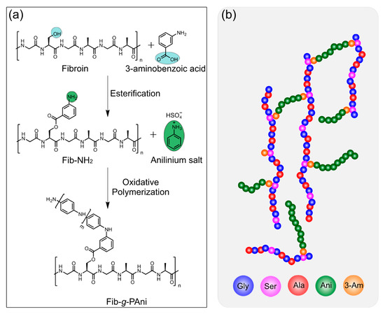 (a) Consecutive reactions for copolymer synthesis fibroin-g-polyaniline (Fib-g-PAni), and (b) proposed model of Fib-g-PAni.