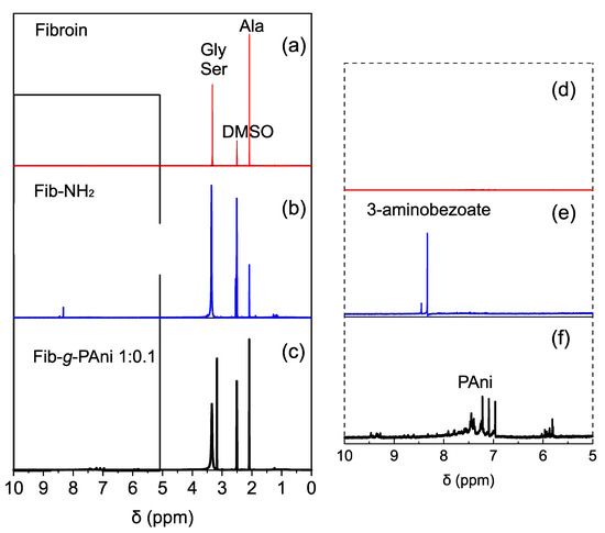 Proton NMR spectra (a–c) and zoom (d–f) from 5 to 10 ppm of these spectra. (a,d) Fibroin (Fib); (b,e) Fibroin esterified with aminobenzoate (Fib-NH2); (c,f) Fibroin-g-polyaniline (Fib-g-PAni).