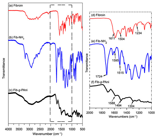 FT-IR spectra (a–c) and zoom (d–f) from 1000 to 2000 cm−1 of these spectra. (a,d) Fib, (b,e) Fib-NH2, and (c,f) Fib-g-Pani 1:0.5.
