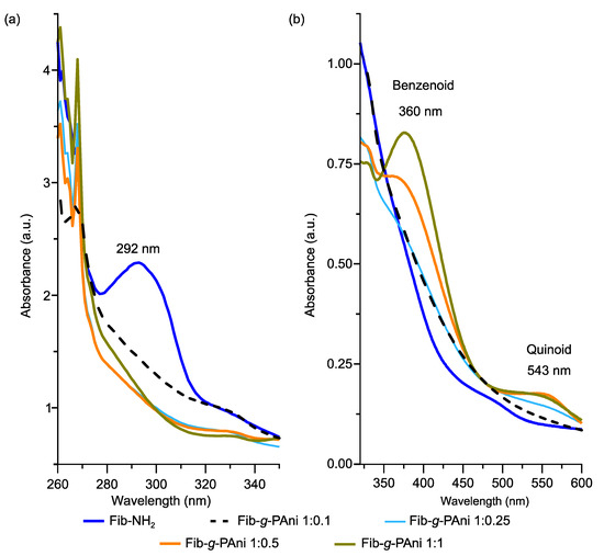 UV-Vis spectra of Fib-NH2 and Fib-g-PAni copolymers (a) UV-Vis spectra from 260 to 350 nm and (b) UV-Vis spectra from 340 to 600 nm.