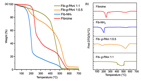 The thermal stability of the materials was determined by thermogravimetric analysis. Figure 5 displays the thermograms and first derivative (DTGA) of Fib, Fib-NH2, and Fib-g-PAni 1:1 and Fib-g-PAni 1:0.5 copolymers. The Fib presents two stages of weight loss; the first is at 238 °C, and represents 70% of the sample weight. This stage is allocated to fragmented Fib chains produced by the degumming process [30]. The second step occurs at 530 °C, attributed to the Fib chain with a high molecular weight [31].