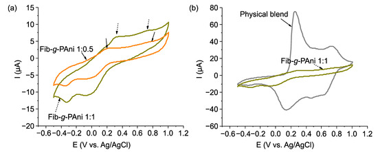 To corroborate the electrochemical activity of the graft copolymers, cyclic voltammetry tests were carried out. Figure 7a shows the voltammograms of the Fib-g-PAni copolymers run in 0.5 M sulfuric acid electrolyte. Both graphs display the oxidation and reduction signals that the polyanilines regularly exhibit [37]. For example, for Fib-g-PAni 1:1, the first peak corresponds to the leucoemeraldine-emeraldine transition at 0.31 V (vs. Ag/AgCl). With the mass ratio of 1:0.5, the signal appears at 0.2 V (vs. Ag/AgCl). This difference could be due to the interaction between PAni and Fib or the degree of polymerization of PAni [38]. The second signal, corresponding to the emeraldine–pernigraniline transition, appears at 0.73 V (vs. Ag/AgCl) in both cases. The location of the signals is evidence of the electroactivity of the graft copolymers, which corroborates the results of the UV-vis study.