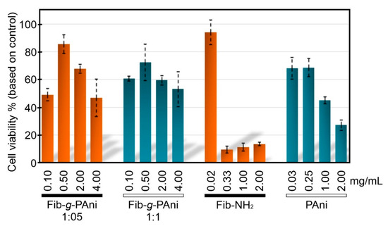 It is well known that Fib displays biocompatibility properties, slow biodegradability, and low cytotoxicity [41]. Nevertheless, these properties are not extrapolated to structural modification and composites derived from Fib. For this reason, the cytotoxicity of Fib-g-PAni (1:1 and 1:05), Fib-NH2, and PAni were evaluated with NIH/3T3 fibroblast cells, measured at 24 h using the MTT assay [42], see Figure 8. The time for cell-tested viability was selected as the first approach. The use of fibroblasts is because they are the main active cells of connecting tissue, and are commonly used as models for viability/toxicity studies. In addition, the fibroblast presents an improved proliferation in the presence of Fib [43]. It is important to note that the concentrations used were established based on the content of PAni reported by previous research. For example, the PAni cytotoxicity results for fibroblast NIH/3T3 cells [44] and macrophage cells [45] are similar to previous works.