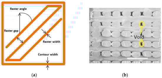 Raster gap voids [29]: (a) FDM process parameter [18] and (b) cross-sectional view of ABS printed part with 0/90 rasters. Reprinted with permission from [33], 2003, Emerald Publishing, Bingley, UK.
