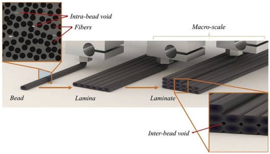 Higher loading leads to an increase in viscosity and a decrease in flowability, leading to processability problems such as clogging of the nozzle. Furthermore, fiber reinforcement may cause negative effects on interlaminar bonding and the properties of printed parts. Based on previous research, interlamellar matrix regions between the reinforced fiber layers are critical regions that are highly prone to delamination when subjected to mechanical stress. Delamination can result from weak fiber-matrix bonding, which often leads to internal damage in composites, potentially leading to global failure of the component with reduced strength and stiffness [77]. Furthermore, porosity and weak interface bonding between fibers and matrix have been cited as a major problem for 3D printed fiber reinforced polymer composites [78]. Understanding the mechanism of filament bonding is important to further investigate how FRPC works to reduce voids and increase the strength of the interlaminar bond between the deposited filaments.