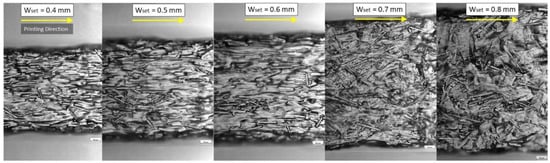 Fiber orientation at different extrusion width (Wset), where fibers were more aligned in a narrow extruder compared with a wider extruder. Reprinted with permission from [118], 2022, Elsevier, Amsterdam, The Netherlands.