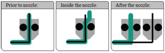 Methods of continuous fiber implementation based, grey areas are the nozzles, green strings are the extruded thermoplastics, and the black strings are fibers. Reprinted with permission from [124], 2017, Elsevier, Amsterdam, The Netherlands.