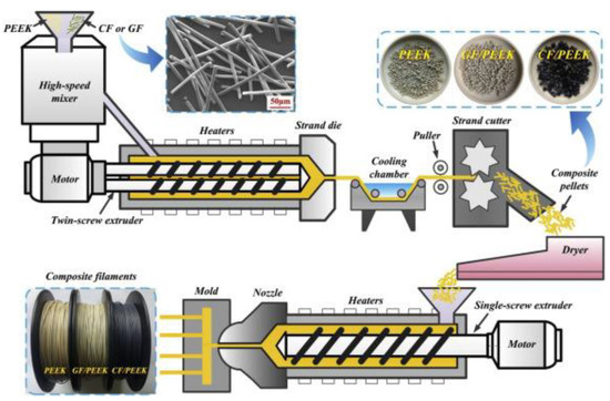 - Wang, P.; Zou, B.; Ding, S.; Huang, C.; Shi, Z.; Ma, Y.; Yao, P. Preparation of Short CF/GF Reinforced PEEK Composite Filaments and Their Comprehensive Properties Evaluation for FDM-3D Printing. Compos. Part B Eng. 2020, 198, 108175. [Google Scholar] [CrossRef]